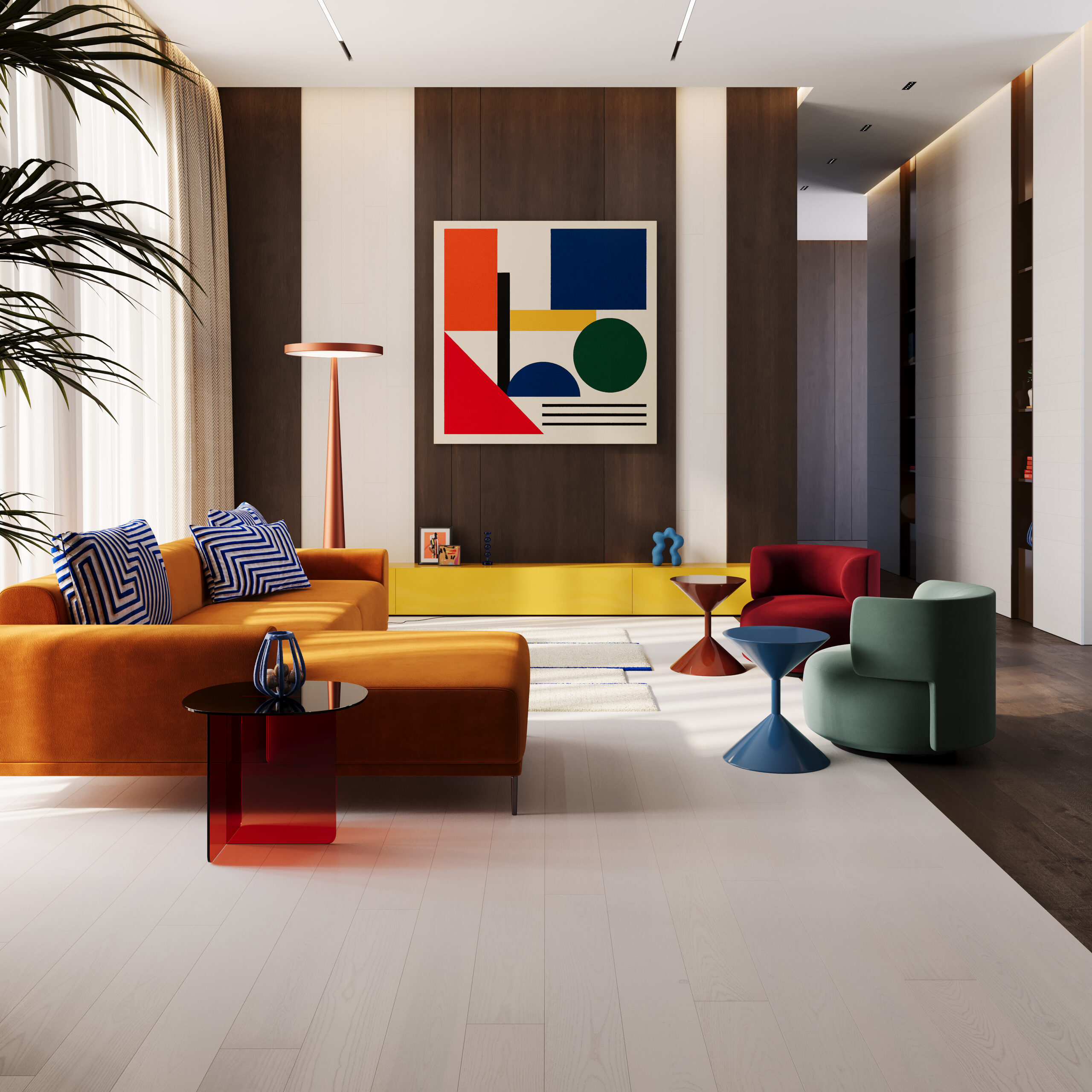 Enstavsgolv med frostig citronnyans. Modern och vågad form, mattlackad i vitt. Subtilt fasade kanter gör att plankorna ser längre ut. Strukturen hos det borstade träet är framhävd och dess naturliga egenskaper exponeras på ett balanserat sätt.
