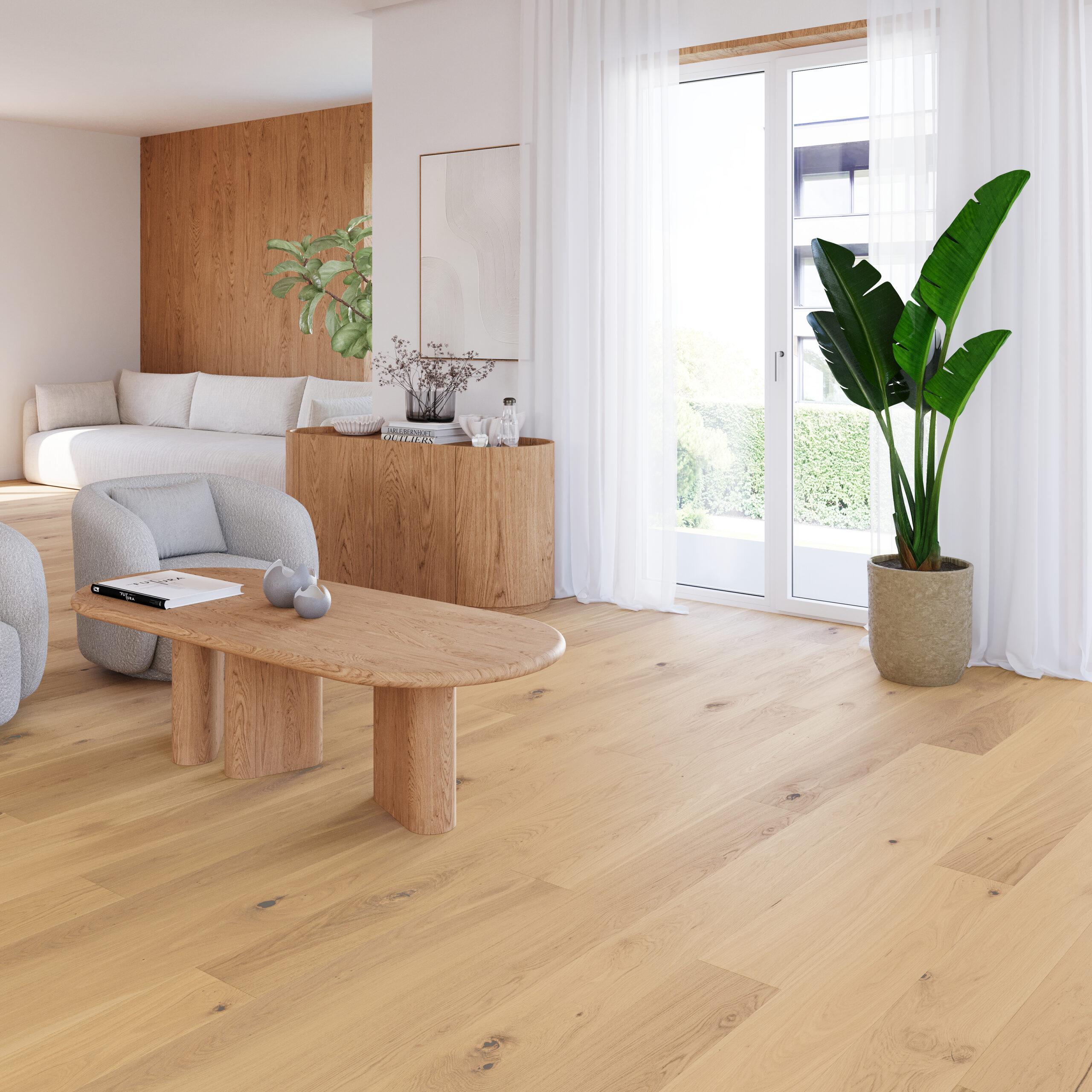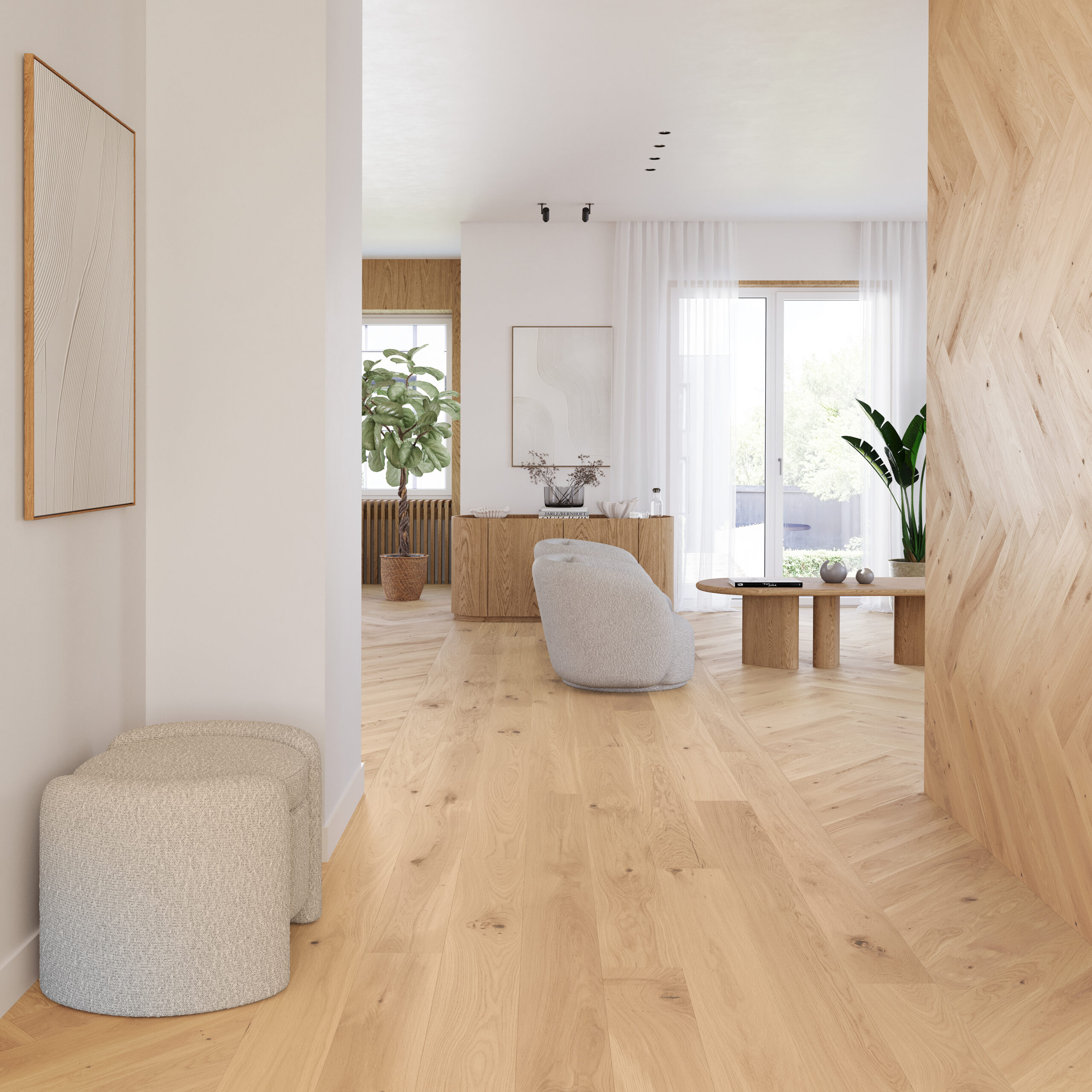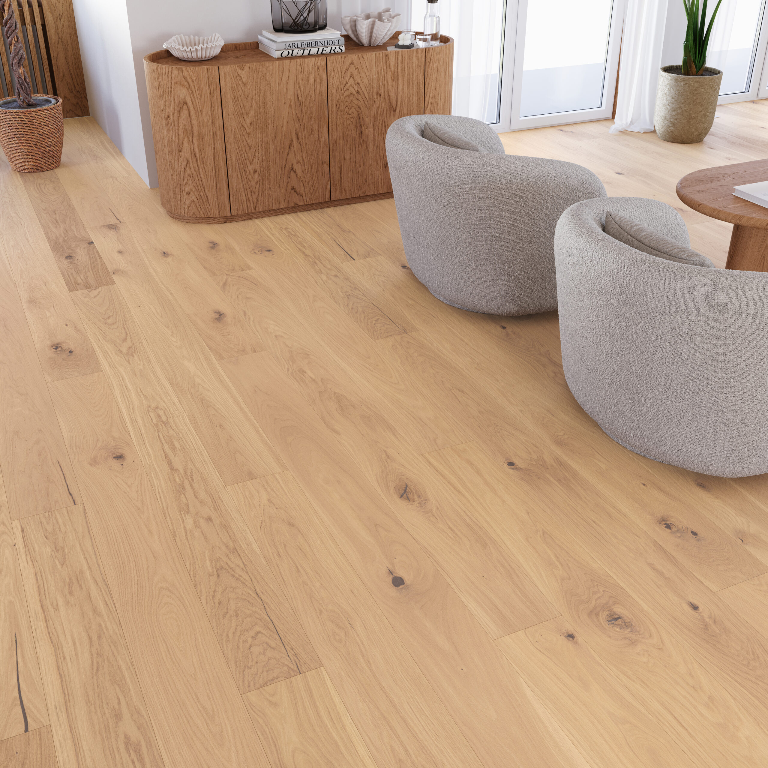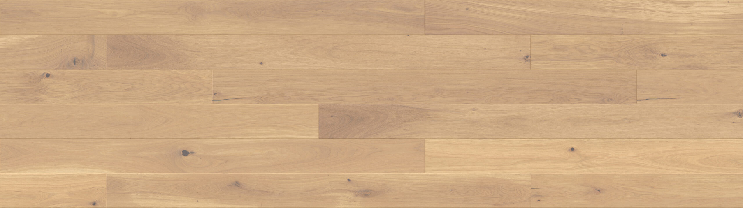 Elegant gräddvitt ekgolv med en mycket rik och tydlig struktur framhävd genom borstning. Plankkanterna är fyrsidigt fasade och och hela ytan är behandlad med matt lack. Ett färgstarkt, uttrycksfullt och varierat ekgolv.
