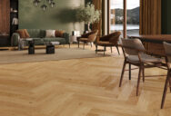 Ett ekgolv med en vacker färg och en liten mängd av naturliga träegenskaper. Den naturliga karaktären har understrukits med hjälp av borstning, och fyrsidigt fasade kanter gör att plankorna ser smalare ut. Ytbehandlad med naturlig olja.