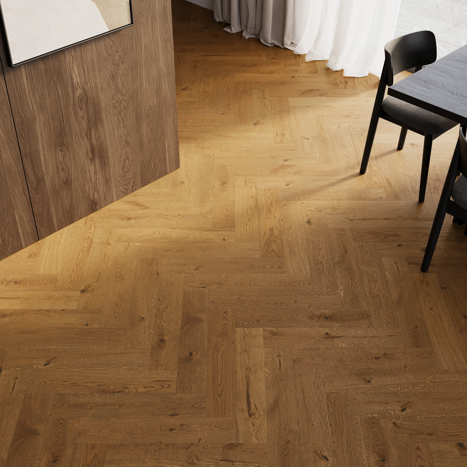 Ett ekgolv betsat i en varm, antik brun färg. Ytbehandlat med mattlack. Trästrukturen har accentuerats med borstning och brädans kanter är mikrofasade. Här i ett utförande med en enstavs-bräda.