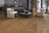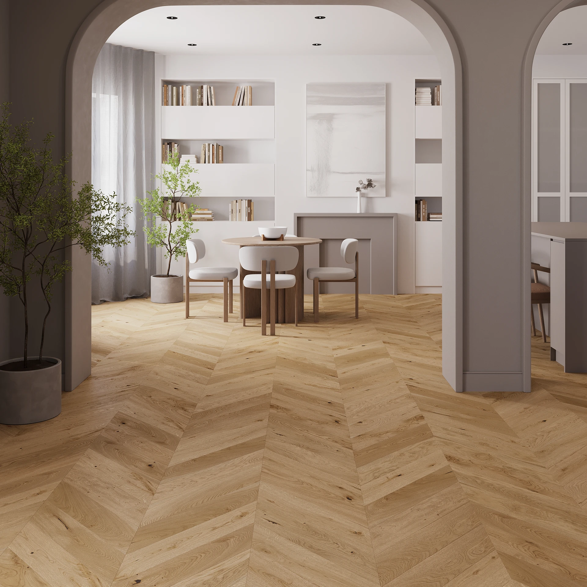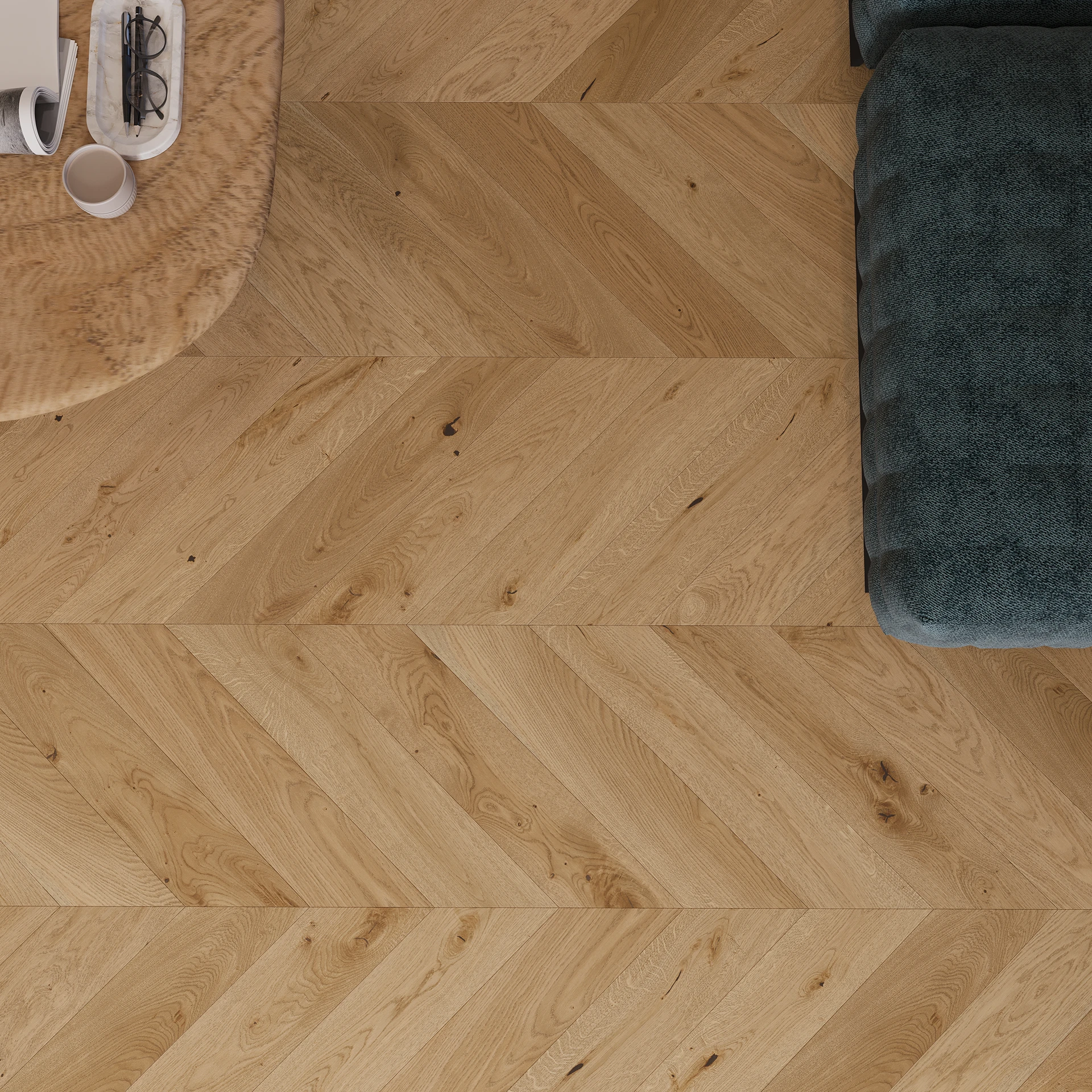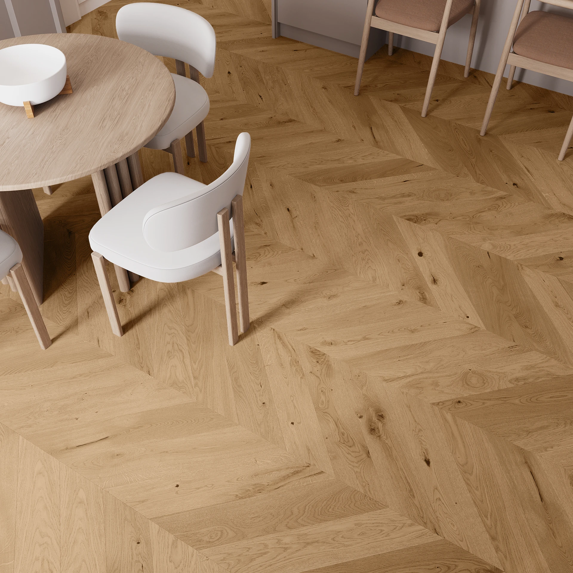 En bräda i ek med starkt exponerade träegenskaper som har en skön nyans av varm brons. Golvet har genomgått borstning och fasning som har hjälpt till att betona strukturen och formen. Slutförd med mattlack.