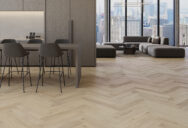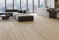 Ett modernt gråfärgat ekgolv med en urbanistisk karaktär med synliga fasade plankkanter. Träets naturliga egenskaper har framhävts genom borstning och sedan tonats ned med matt lack. Subtilt och vackert utseende.