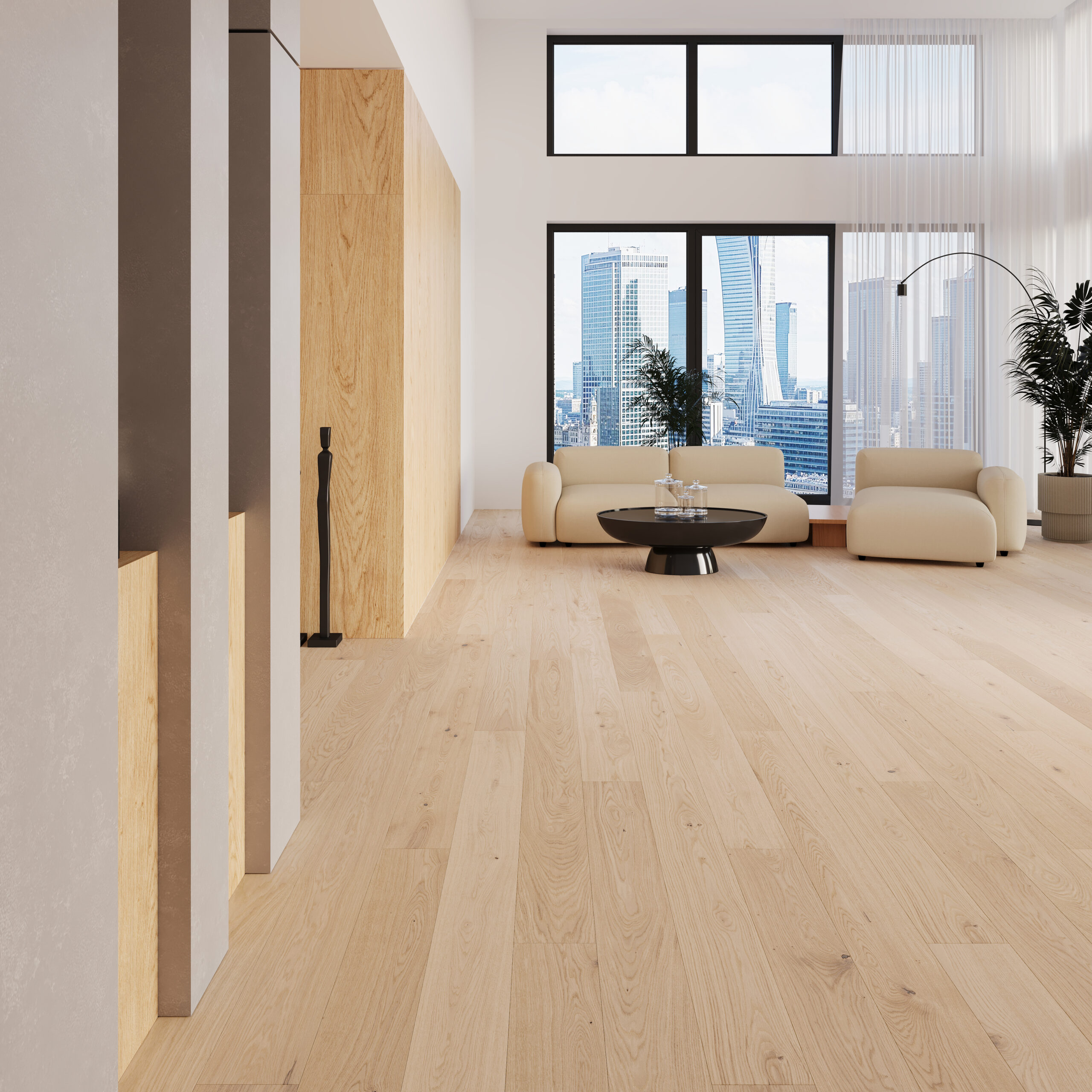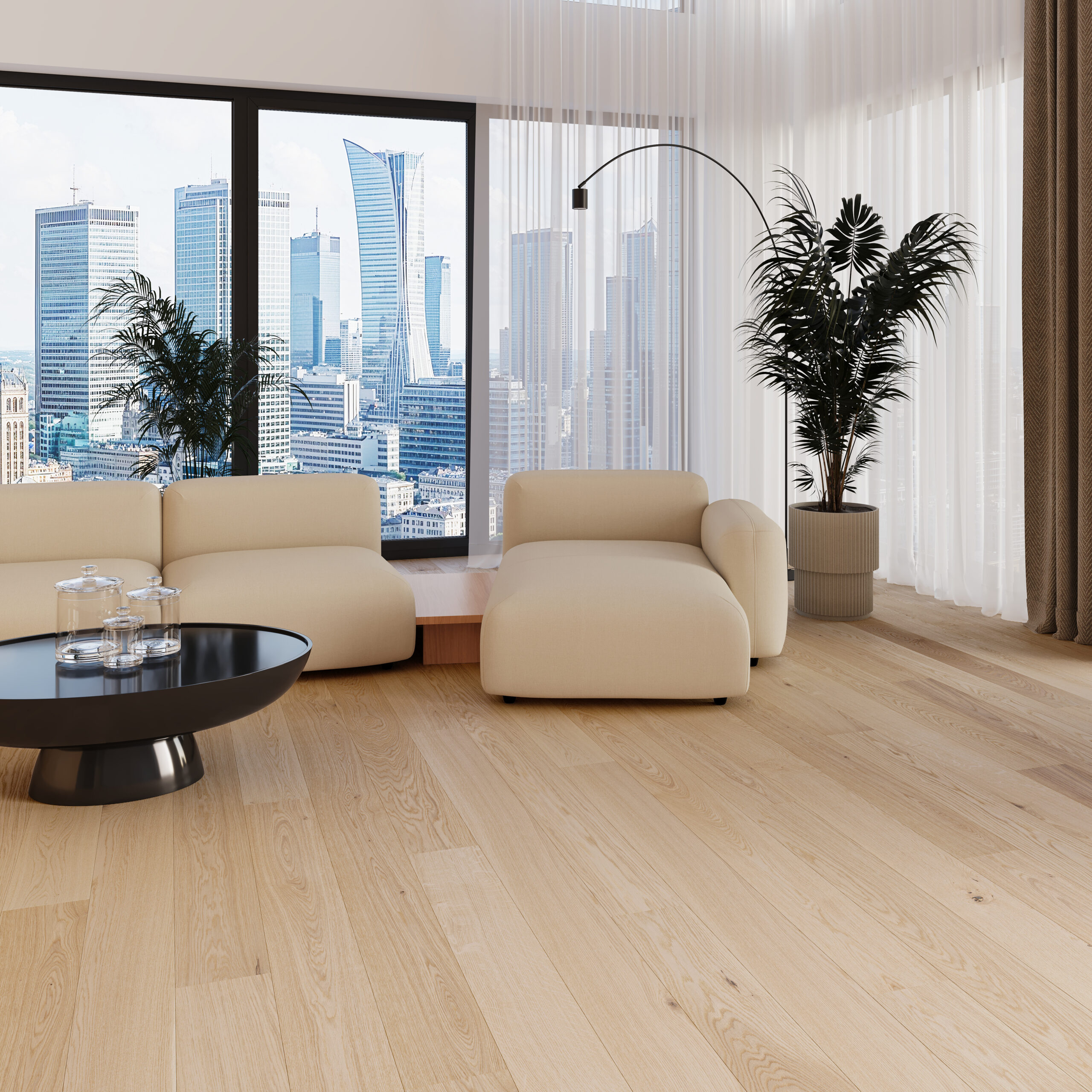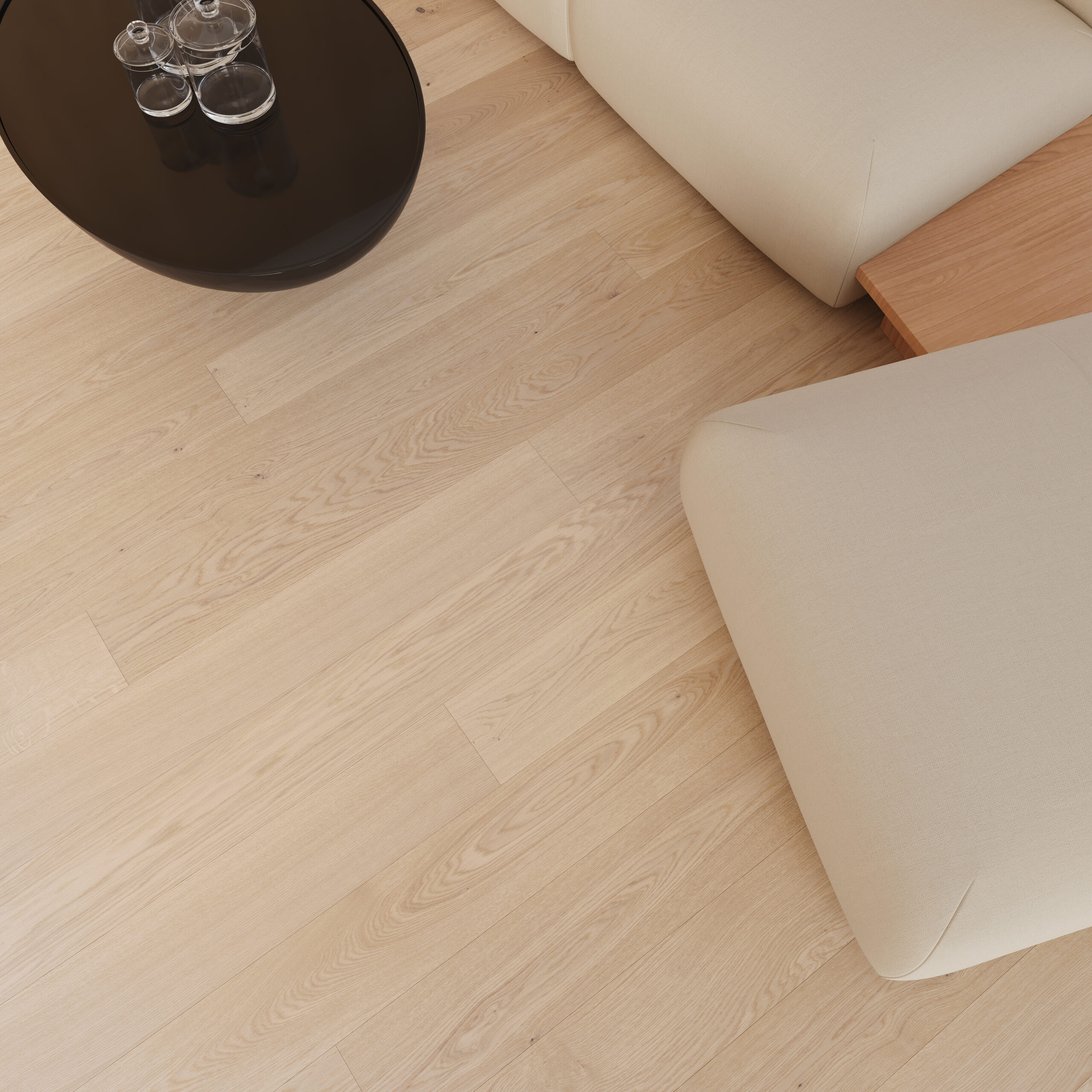 Whitewashed plain oak floor underlined by gentle shades of grey seeping through. Subtle hues will make this floorboard ideal for rooms that you want give that spacious feeling you have always wanted. The brushing treatment gives the floor its special character. Finished with natural oil.