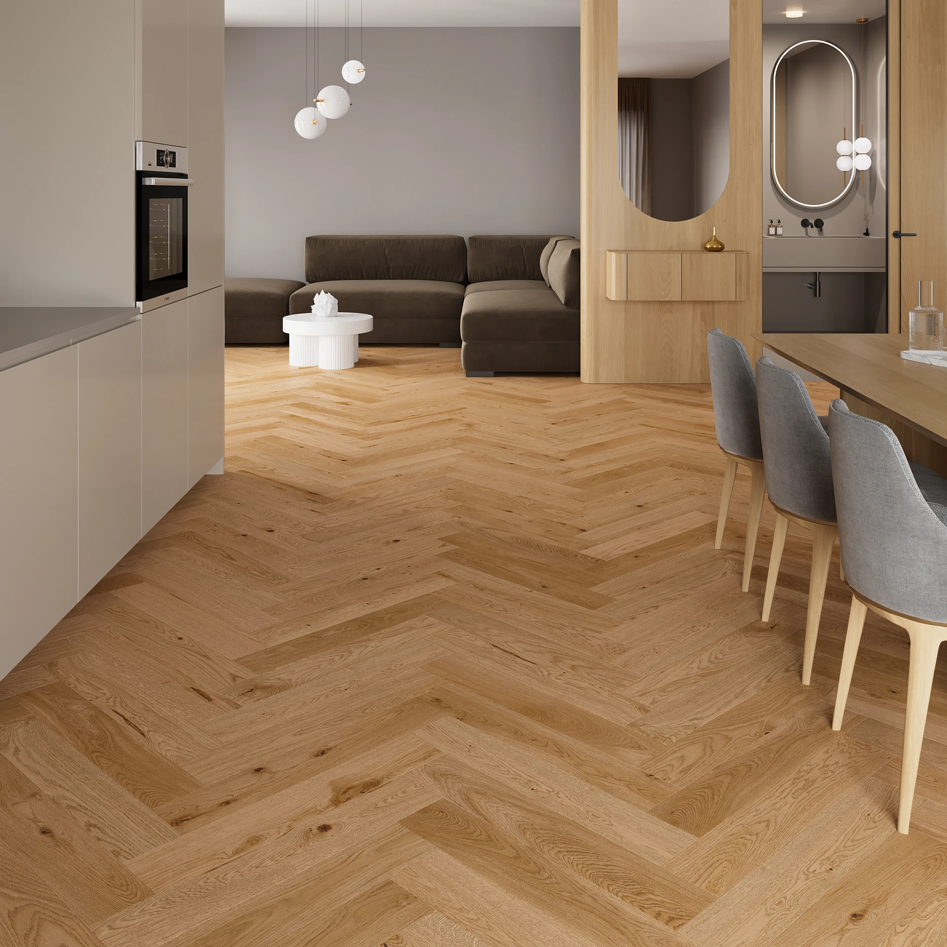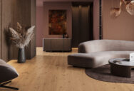 En ekparkett ytbehandlad med en ljusbrun naturolja. Träets struktur har framhävts under borstningen. Brädans form markeras med fasade kanter runt om.