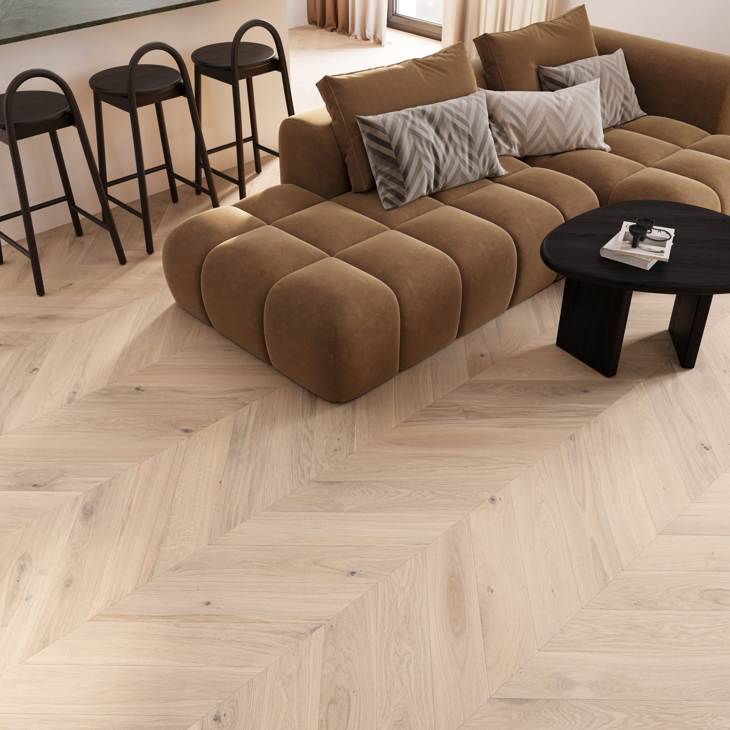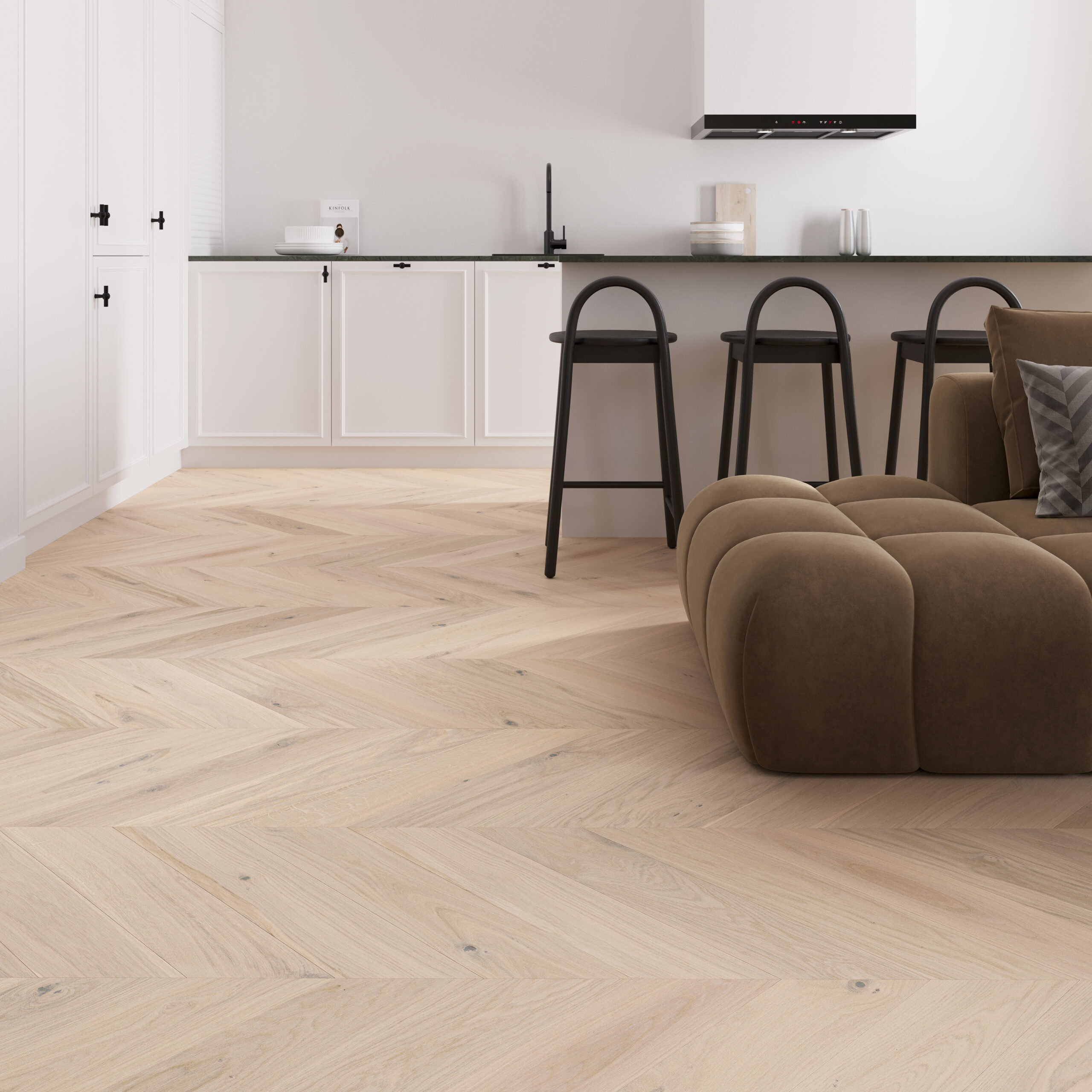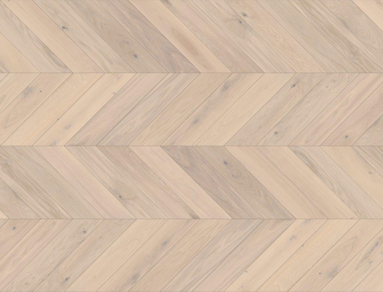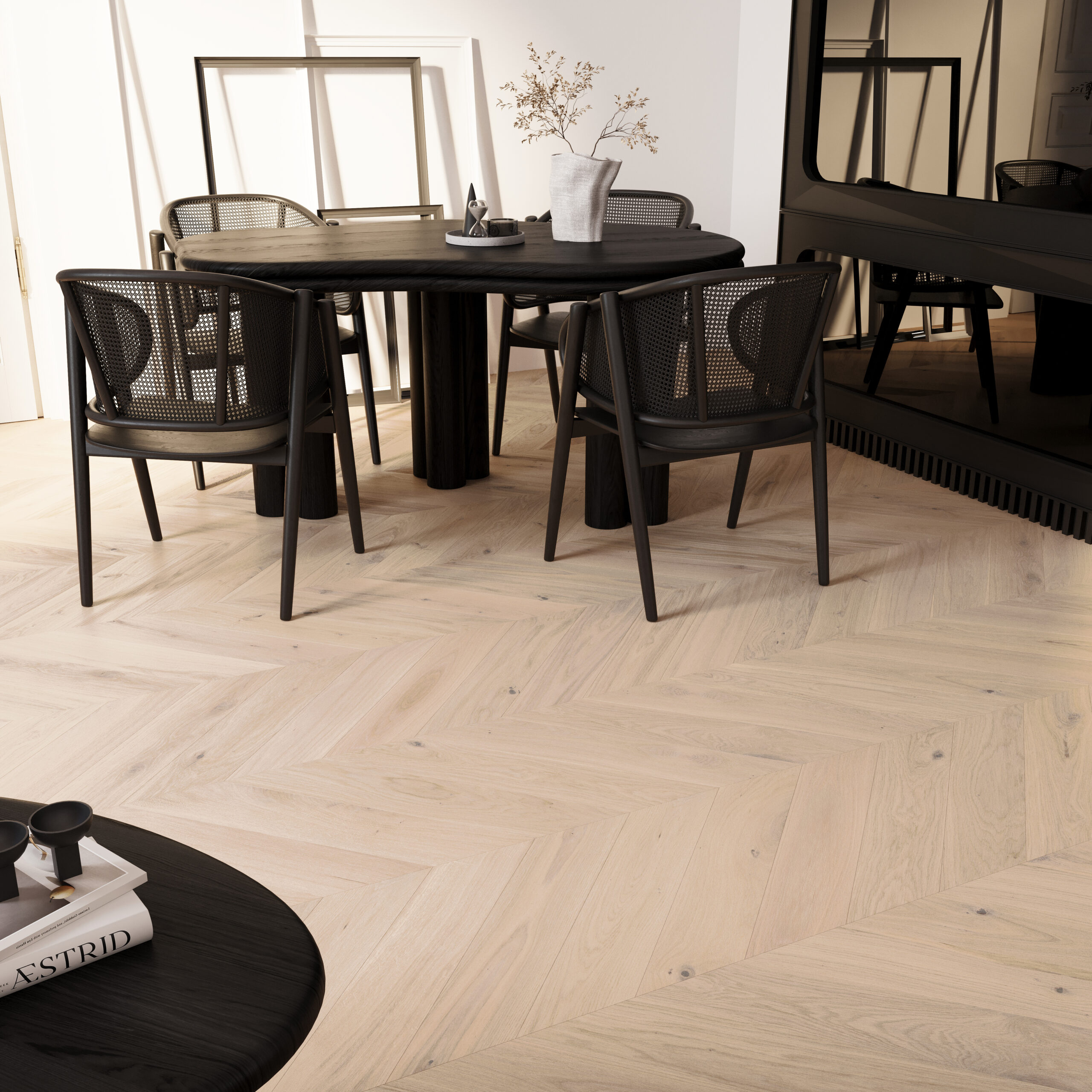 Det klassiska ekgolvet har fått en subtil pärlfärgad vit nyans. Plankorna har en subtil naturlig karaktär som har förstärkts genom borstning. Golvets slankhet och ljushet betonas av Slutförd med mattlack.