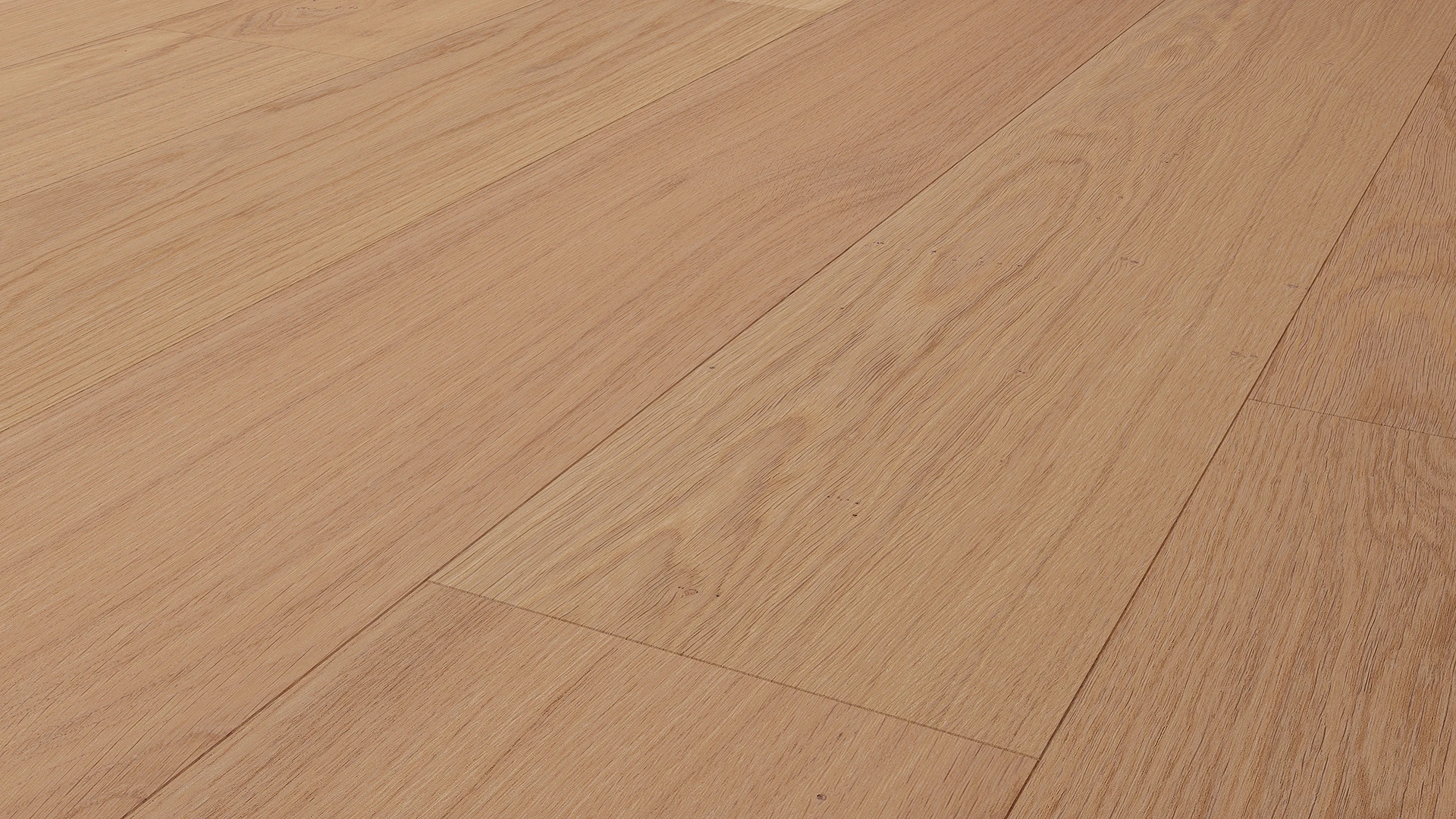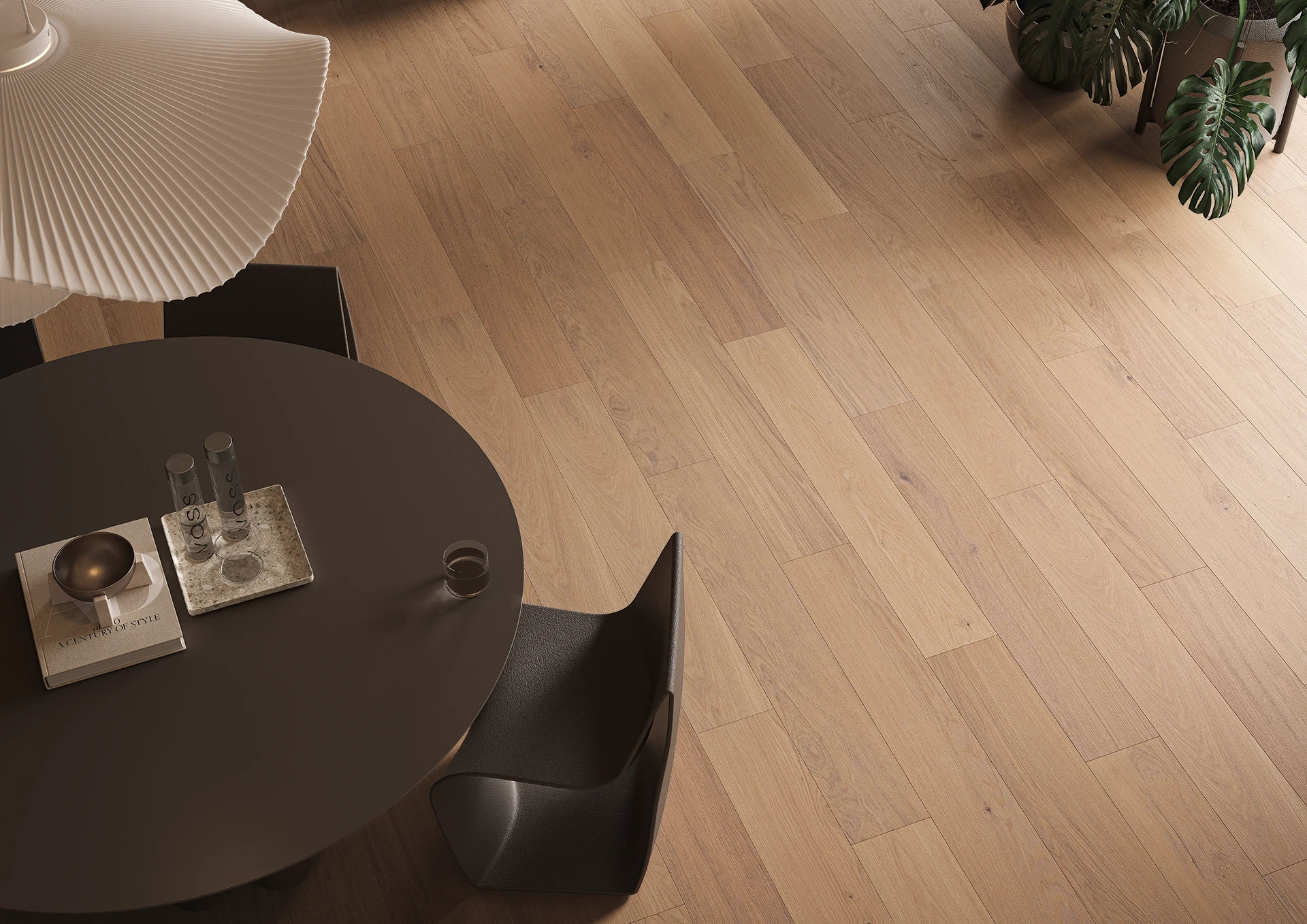 Lätt vitlad ekparkett som kombinerar subtil elegans med naturlig stil. Den mjuka vitningen framhäver ådringarna, ljusar upp träet och ger rummet en fräsch, harmonisk karaktär.